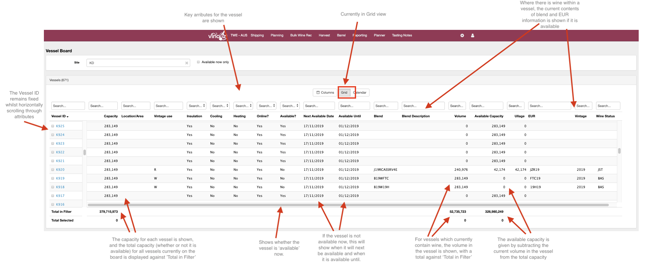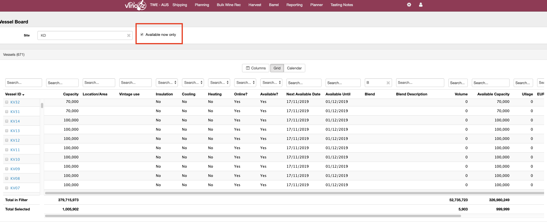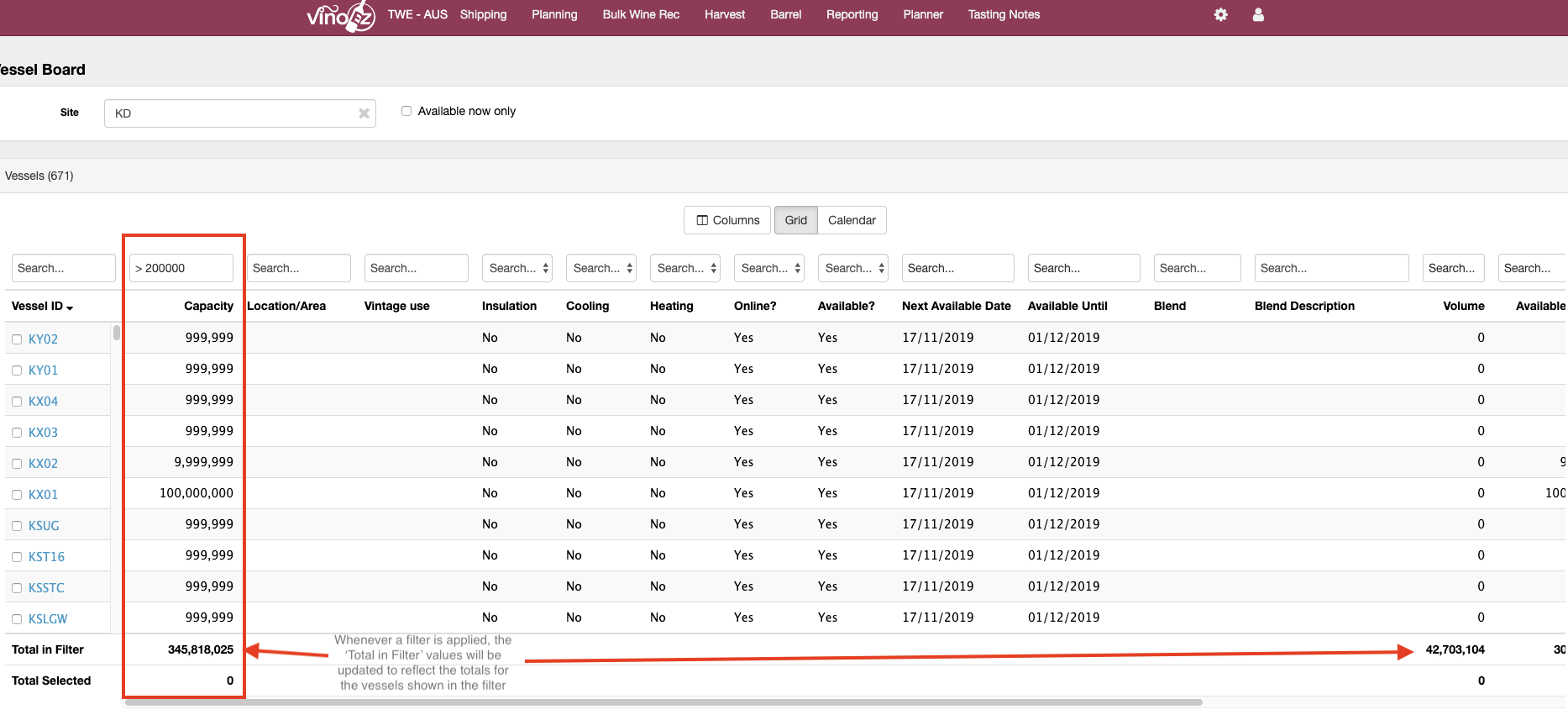 The Available Capacity is shown for all vessels. If a vessel currently contains wine, the Available Capacity will be the Total Capacity minus the current Volume.