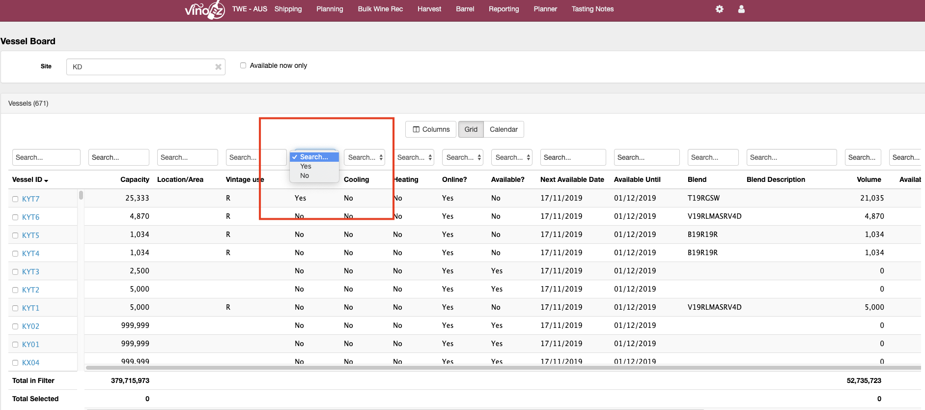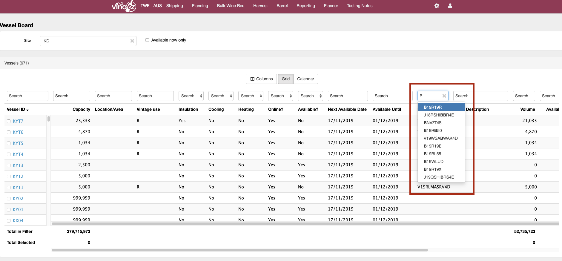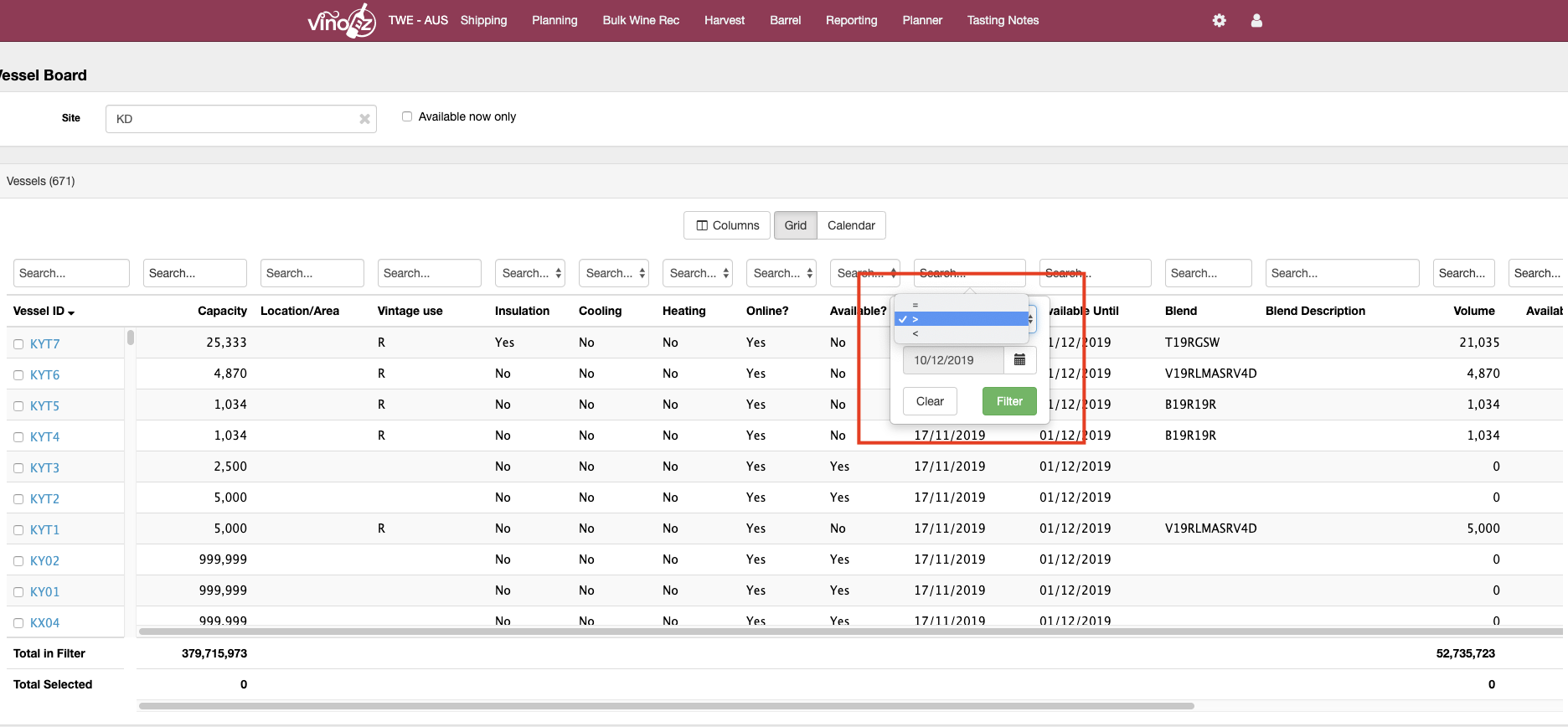In order to narrow down the vessels on the board, vessels can be searched through and filtered based on all attributes. When filtering the values against the ‘Totals in Filter’ row at the bottom of the grid will always update to reflect the totals for the vessels shown in the filter. This is to assist planners when trying to find a set of tanks for a specific total volume to assign work against.